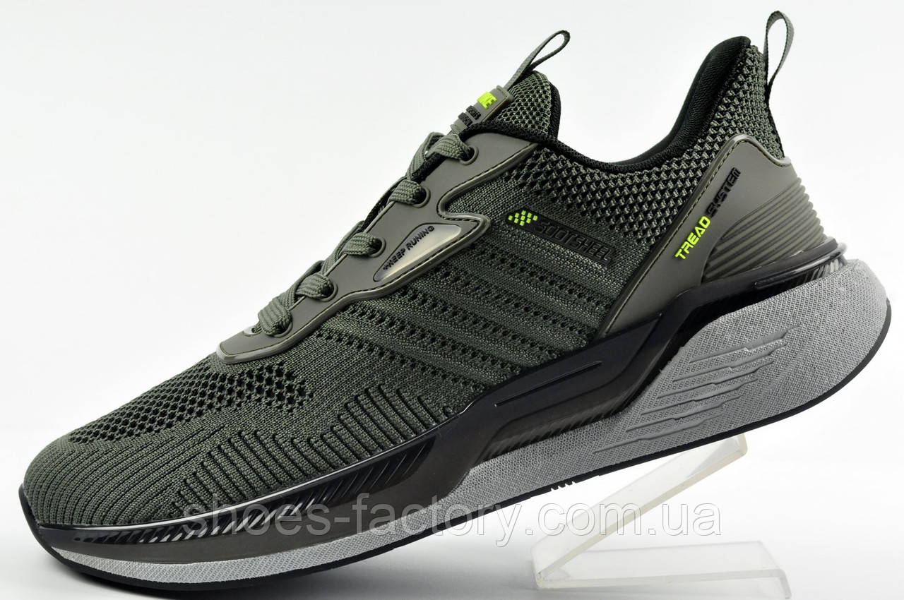 Дуже легкі чоловічі кросівки Ви можете купити в нашому інтернет-магазині. Верхня конструкція виконана з текстильної в'язки. На заднику є гумова накладка для стійкості п'яти під час руху. Підошва із пінного матеріалу. Модель кольору хакі. Кросівки за доступною ціною